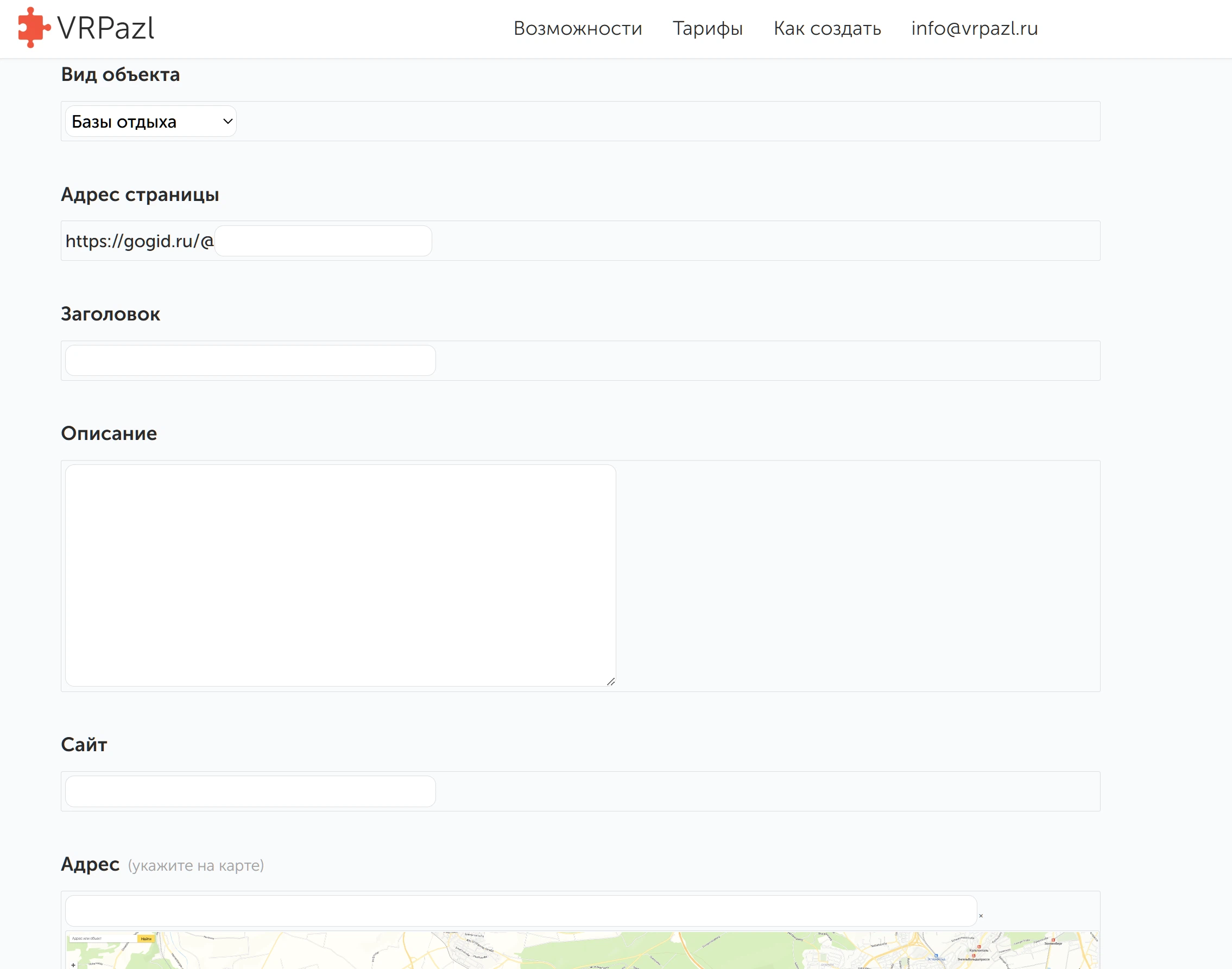 Чтобы добавить тур на наш сайт, создайте его с помощью конструктора виртуальных 3D-туров VRPazl.ru. В личном кабинете (vrpazl.ru тариф ПРО) выберите виртуальные туры для размещения и при необходимости заполните дополнительные настройки — вид объекта, описание, адрес, сайт и другие. Размещение доступно для объектов гостеприимства, туризма и культуры.